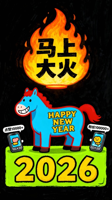 画面中央的主体是一个倾斜的展示的圆柱形的拟人的爆竹角色(主体为紫色,横向缠绕着几条红色的宽条纹,爆竹顶端正向外喷射出一个巨大的爆炸形状,这个爆炸物由橘色和黄色组成,边缘有一圈蓝色的锯齿状线条装饰,中心点向外辐射出七八根细长的浅色小棒,黑色的手脚)。画面右侧点缀着一些图形元素,包括一个白色的六角形符号、一个像回纹针一样的环形图标以及两个并排的四角星符号。画面底部占据近三分之一高度的是巨大的白色加粗无衬线英文字体,分为三行排列,分别是“HAPPY CHINESE NEW YEAR”、“H@RSE 2026”以及“CHUNJIE”。画面左上角垂直排列着红色的汉字文案“(爆竹) * (迎春)”。画面右下角有横向排列的白色文字“(新年) 新 (开端)”,其中中间的“新”字被一个圆圈包围,右侧还带有“HAPPY NEW YEAR 2026”的小字。画面顶部有三列精细的英文排版,包含“AICG DESIGN”、“Good luck Good health Good cheer”、“@2026”等细节文字。画面中部左侧有一段长篇的英文介绍,背景中还隐约衬托着巨大的、仅有轮廓线的数字“2026”。背景是一个从顶部的白色向底部的橙红色平滑过渡的竖向渐变色块。整体构图呈现出一种极简且富有高级感的节日海报布局。