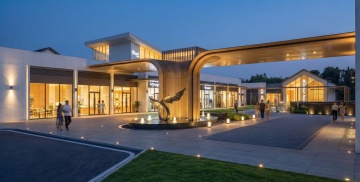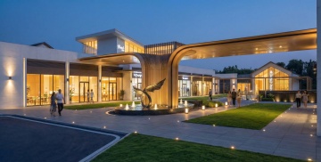 这是一张鸟瞰效果图,保证图片的主体的细节及角度不变,添加室内柔和灯光效果,按黄昏偏夜景渲染出图。采用写实主义渲染方式,画面呈现出明亮通透的夜晚氛围,建筑淡黄色内光与冷调天光形成温和对比,使整体氛围静谧而富有生机。建筑材质清晰准确,玻璃有灯光反射质感,角度不变。绿色均为草皮绿化。保证道路不变形,道路加些灯光点缀。加些人物在场景内,一层建筑墙体加一些灯光点缀。水面加些灯光点缀。建筑北侧是山林,按超高清标准出图