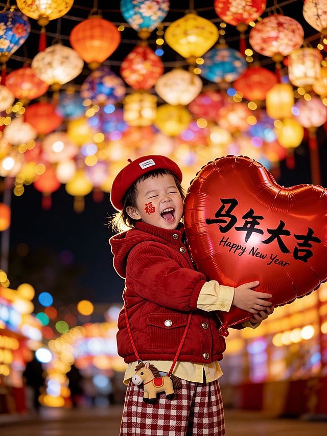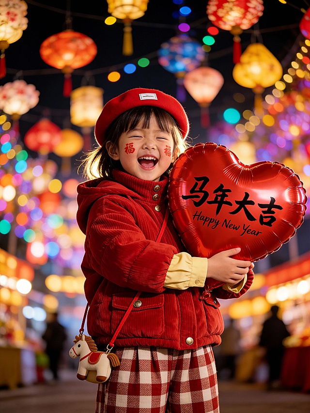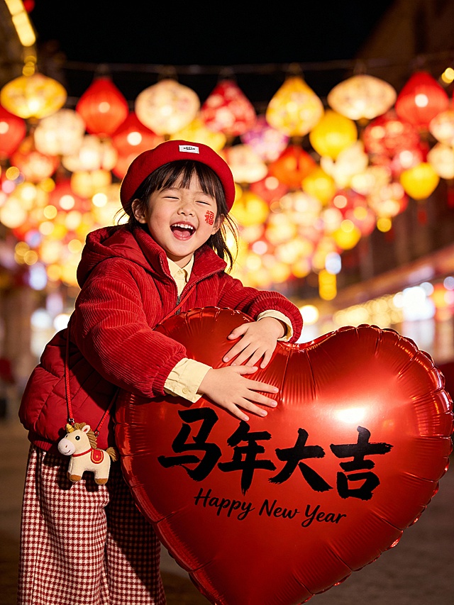 国潮风与刺绣风交融,母女共写祈福牌,红灯笼映衬温馨场景,复古实景中透出浓郁中式喜庆感与民族温情。详情