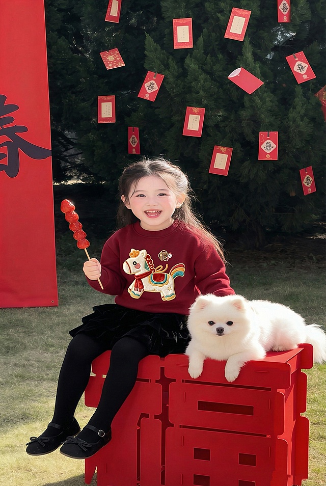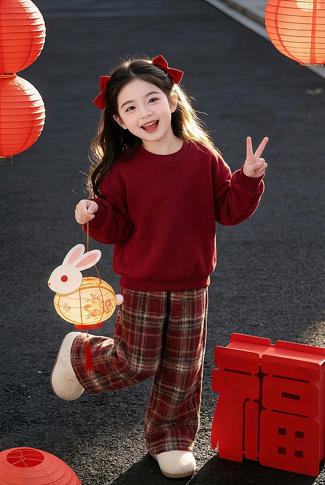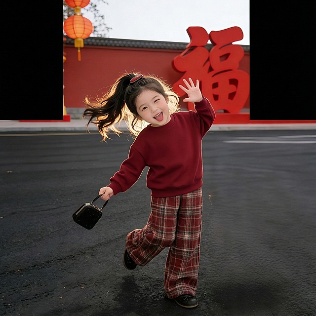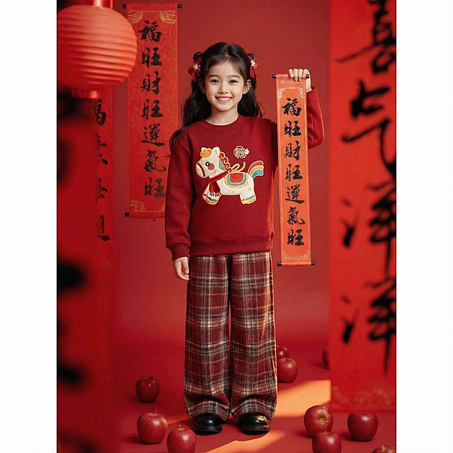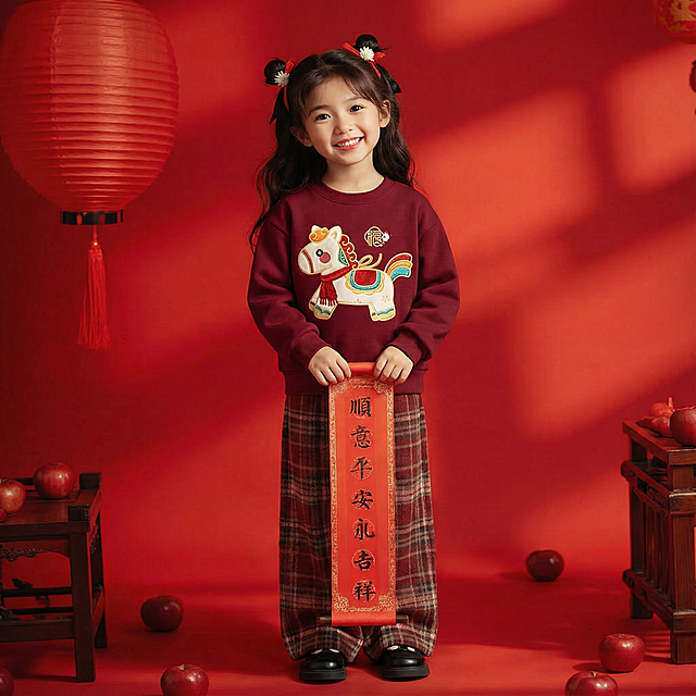 国潮风刺绣童装,融合中式元素与现代设计,红黑配色尽显喜庆感,孩童手持春联,背景古建筑与灯笼烘托浓厚节日氛围。详情