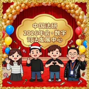 背景:选择卡通年会派对场景,红色幕布 + 金色气球拱门,地面铺红色地毯,背景板写 “中国法研 2026 年会・数字司法发展中心”,字体圆润可爱。