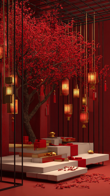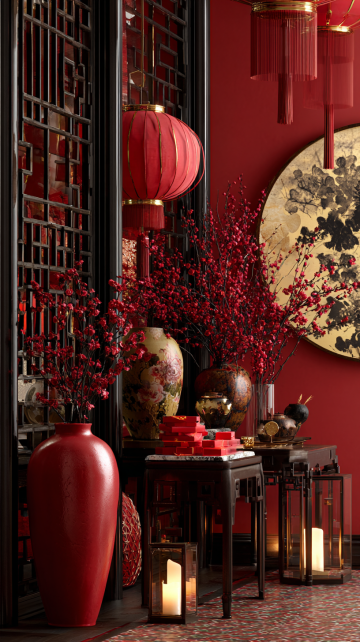 3D render, festive Chinese New Year interior, modern Chinese style, deep red and gold color scheme, black wooden lattice screen, red and gold round lanterns, blooming red plum blossom branches, ink wash round wall art with golden accents, red side table with white marble top, glass vase, red envelopes and golden ingots on the table, warm festive lighting, joyful and luxurious atmosphere, ultra-realistic