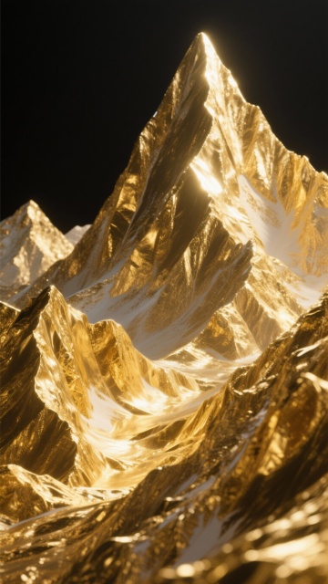 A majestic mountain range entirely made of polished, glowing gold, with sharp peaks catching the light against a deep, pitch-black background, hyperrealistic 3D rendering, ultra-detailed textures, dramatic lighting, cinematic atmosphere, luxurious and opulent vibe, high contrast between the bright gold and dark void, 8K resolution, wallpaper-ready