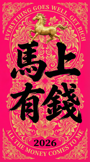马年新春海报,喜庆红底配鎏金浮雕纹样,国潮风十足。大字“马上有钱”笔力遒劲,金色骏马踏字而立,寓意吉祥富贵,尽显中式年味与财运亨通之兆。