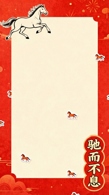 国潮风插画,剪纸与鎏金元素结合,骏马驮金寓意“马上有钱”,红金配色尽显喜庆中式感,大字书法点睛节日氛围。