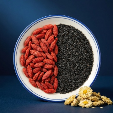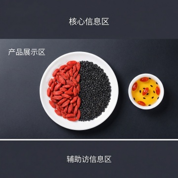 根据提供的素材生成五张一个盘子里一半韭菜籽一半枸杞组合主图,抖音爆款主图,要有质感高清