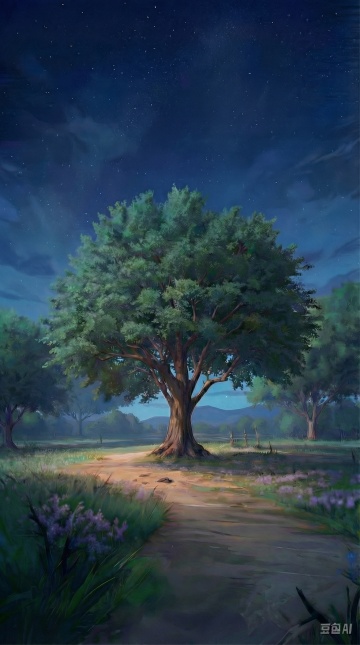 日系动画风格插画,黄昏时分的森林小径,参天大树林立,枝叶间洒落温暖的橙黄色夕阳光线,地面铺满落叶,两侧点缀着野花和低矮灌木丛,天空呈现渐变的橙红与深蓝,云层被染成金色,整体氛围宁静而温暖,光影对比柔和,细节丰富,色彩和谐,构图采用纵深透视,营造出神秘悠远的意境。