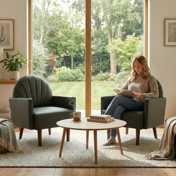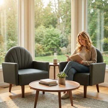 请根据图一参考图给图二沙发椅生成一张场景图,需要跟图二一样的两个椅子,中间发那个一个小茶几 ,一个外国女人坐在椅子上看书喝咖啡,尺寸要1:1的尺寸