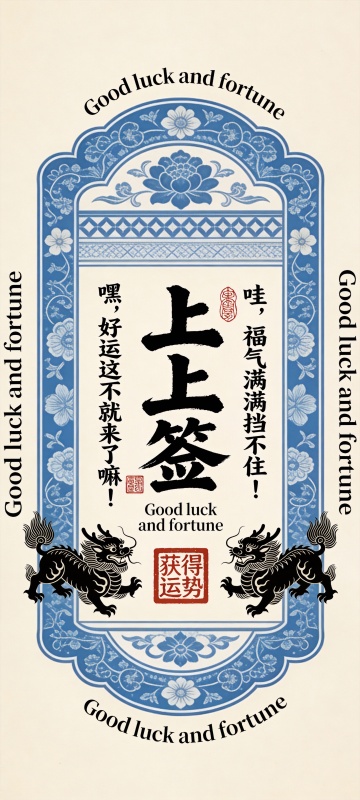 国潮风与古典感融合,青花瓷纹饰环绕大字“上上签”,剪影龙形护佑,印刷风排版尽显喜庆祥瑞。