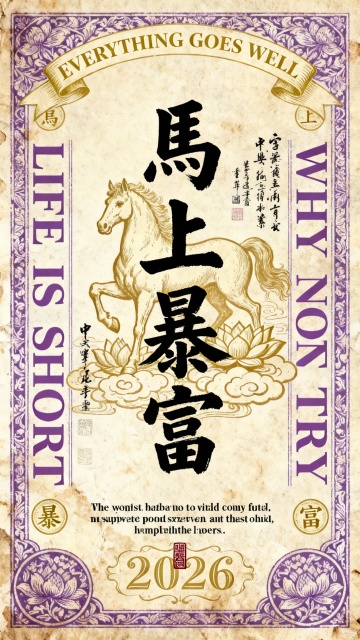 复古纸质感搭配鎏金工笔马与大字风“马上暴富”,融合中式边框与国潮元素,喜庆印刷风设计,寓意2026年好运连连。