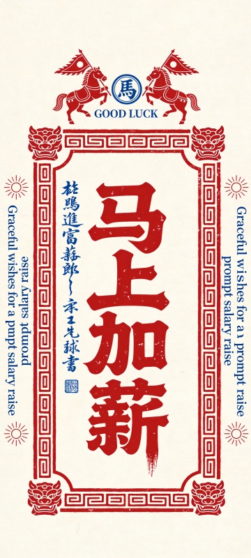 国潮风版画设计,红蓝配色凸显中式复古与喜庆感,大字风“马上加薪”搭配马纹图腾,印刷质感十足,传递新春祝福与升职好运。