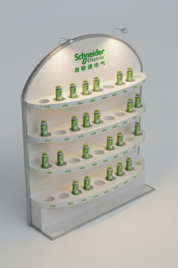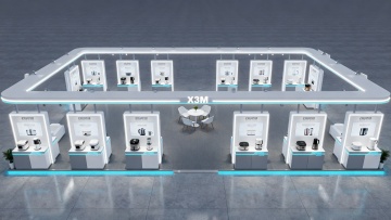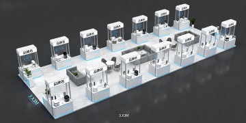 一个现代简约风格的展台设计,展台主体为几何形态的白色立方体展示台,带有简洁的分层结构,放置在一个明亮的空间内。背景保留大面积的白色墙面,墙上有由窗户投射进来的清晰几何阴影图案,地面为光滑的反光材质,整体空间干净通透。采用深蓝色与浅灰色的配色方案,展台边缘有细微的蓝色线条勾勒,墙面局部有浅灰色的渐变处理,光线柔和,营造出专业、冷静的氛围。设计注重留白和视觉层级,整体简洁大方,符合现代产品展示的需求,没有多余装饰元素,信息传达高效直接。