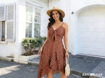 请优化下这个波点裙模特的脸部表情 其他不要改动 保持高清画质