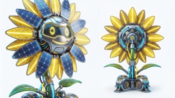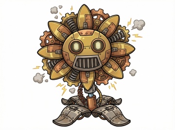 以这个植物角色为原型,生成不同变异的风格的属性形态,分别是暗黑、寒冰、烈火、剧毒、机械、雷电的风格,白色背景,横版,卡通的画风