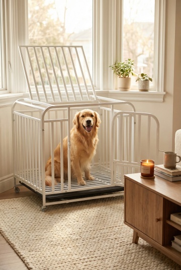 美式庭院场景,中央放置小宠围栏,围栏内几只兔子正在玩耍,背景是美式风格的建筑物并适当虚化,庭院中有草坪、花卉和休闲桌椅,阳光明媚,整体氛围温馨自然