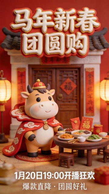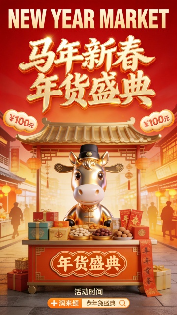 喜庆红金配色,中式市集场景融合国潮元素,拟人化小马IP萌趣十足,软3D质感搭配印刷风细节,营造热闹新春氛围。