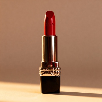 手持动感氛围图 核心提示词:商业产品摄影,一只纤细的手握着口红,背景是流动的红色丝绒布幔和浅粉色渐变墙面,点缀金色闪粉,光线柔和有动感,突出口红的光泽质感,整体氛围高级且富有生命力,8K超高清,写实风格。