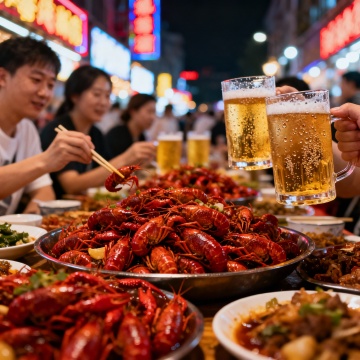 一个白色瓷碗中盛满鲜红诱人的麻辣小龙虾,汤汁红亮,表面点缀翠绿葱花和鲜红辣椒段,一只小龙虾跃出碗外,汤汁与香料颗粒飞溅,周围散落八角与红辣椒,置于热闹繁华的夏夜大排档木质餐桌上,背景有模糊的霓虹灯光与食客身影,整体采用高对比度、暗调背景突出主体食物的鲜亮色泽,光影聚焦于小龙虾的油润质感与动态瞬间,营造出热烈诱人的美食氛围,超写实摄影风格,细节丰富,色彩浓郁。