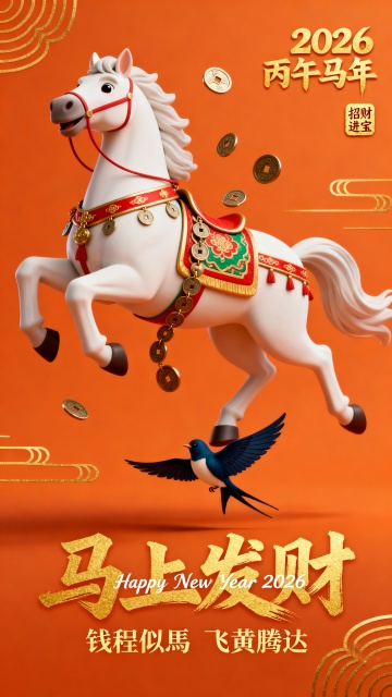 3D拟人马仔身着国潮唐装,手持金元宝与锦鲤,融合剪纸云纹与鎏金元素,喜庆卡通风迎丙午除夕,寓意财运亨通、年年有鱼。