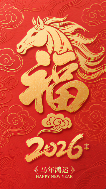 国潮风剪纸与鎏金浮雕结合,大字“福”融合马形,红金配色彰显喜庆中式感,祥云纹饰烘托民族韵味,呈现2026马年鸿运主题。