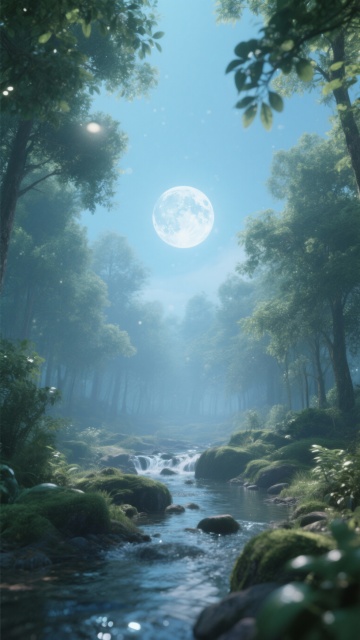竖幅构图,水墨晕染技法绘制的中式深山古寺晨雾场景,画面以靛青与石绿为主色调,冷冽的月光从千年古松的虬枝间洒落,形成银蓝色的光柱穿透薄雾,前景是青石板铺就的湿润山路,水洼中倒映着寺檐飞角与半隐的弦月,石板缝隙间生长着苔藓,中景是几株苍劲的古松与斑驳的寺墙,右侧有一座半露的石灯笼,背景是被雾气笼罩的层叠山峦,山巅隐约可见一座孤塔剪影,空气中漂浮着细小的水珠,色调是清冷的墨蓝与翡翠绿的交融,雾气呈现出浓淡不一的水墨层次感。