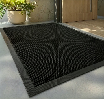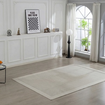 现代极简风格的客厅场景,以浅灰色调为主的现代家具布置,画面聚焦于铺在浅灰色瓷砖地面上的浅灰色条纹地毯特写,地毯表面有细腻的竖条纹纹理和柔软的编织质感,占据画面下方大部分区域;背景中可见浅灰色布艺沙发,搭配几个同色系的靠垫,沙发旁有一个圆形金属边框的小茶几,靠墙处有一个简约的灰色搁板,上面放置一个小型装饰画框;右侧是大面积的落地窗,透过轻薄的白色纱帘洒入明亮柔和的自然光,光线在地毯和地面上形成自然的光影过渡,窗外可见模糊的绿色植物,整体营造出宁静、整洁、高级的现代家居氛围,空间感开阔,线条简洁,色彩统一和谐,具有清晰的视觉层次和舒适的居住感。