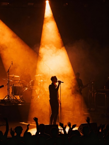 一群人手握装满金黄色啤酒的玻璃杯相互碰杯,杯壁上布满细密气泡,啤酒表面泛着洁白泡沫,阳光透过玻璃杯折射出温暖光泽,背景是户外音乐节现场,舞台上灯光绚丽,台下人群随着音乐舞动,空中漂浮着彩色气球和音符装饰,整体画面呈现出明亮欢快的氛围,光影效果柔和自然,色彩饱和度高,充满热闹欢庆的聚会气息。