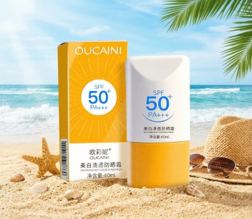 现代3D轻拟物风设计,金属质感瓶身,沙滩背景突显清爽夏日防晒创意。