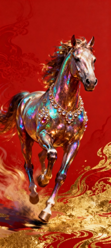 国潮风玻璃马,鎏金浮雕纹饰,清透3D质感,中式复古奢华,梦幻光影交织,尽显节日祥瑞之气。