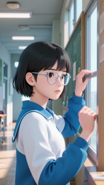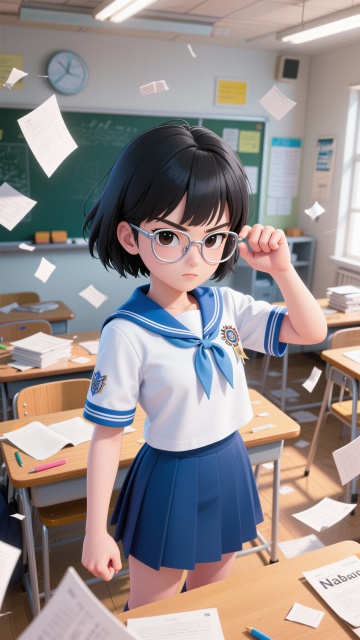 日式动漫风格 主角:林墨(失忆学霸・复仇机器) 帮忙生成三张图,分别为正视图、侧视图、背面图三张 标签强化:清冷学霸感 + 隐忍复仇感,标志性动作(推眼镜指尖敲镜框)贯穿设计 三视图描述词: 正面图:16 岁高中女生,及肩黑短发带碎刘海,细框银边眼镜,校服领口微敞,左手攥拳(青筋微露),右手扶眼镜且指尖轻敲镜框(标志性动作),眼神锐利带隐忍怒火,白皮肤,校服为蓝白配色(袖口有竞赛获奖刺绣),裙摆微掀,背景是教室课桌堆(散落试卷碎片),线条清晰,色彩明亮,细节丰富 侧面图:侧脸线条流畅,眼镜反光遮半眼,嘴角紧抿,头发贴头皮有层次感,校服肩线挺直,右手抬至镜框位置,左手自然下垂(攥拳状态),背景虚化教室走廊,光影分明,比例协调 背面图:及肩短发发尾微翘,校服后颈有小污渍(呼应被陷害情节),背包单肩斜挎(露出竞赛手册一角),步伐坚定,背景是教室后门(门框有划痕),简洁大气,突出轮廓 专属出图关键词:nabanan 画风,校园学霸,复仇情绪,细框眼镜,标志性推眼镜动作,蓝白校服,教室场景,隐忍怒火