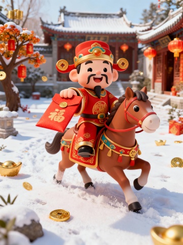 软3D国潮风,卡通财神骑摇马,毛发生长质感,鎏金元素点缀,喜庆红底配烟花与金币,传递春节“马上发财”祝福。