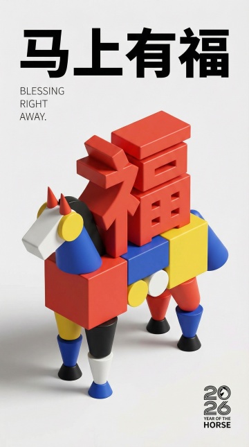 3D几何马载“福”字,孟菲斯风格撞色拼接,塑料质感萌趣十足,喜庆卡通风迎2026马年。