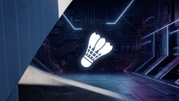 赛博朋克风未来场景中,霓虹光影勾勒出科技感十足的虚拟现实空间,金属质感走廊与电路纹理交织,中央悬浮发光羽毛球,象征科技与运动的融合。