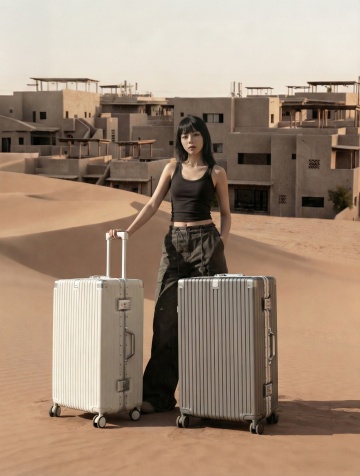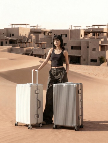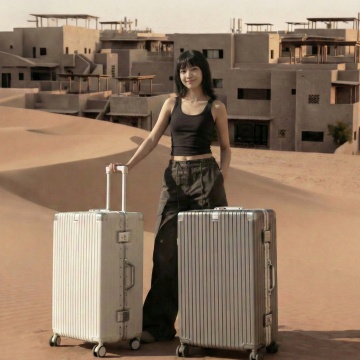 一个银色的硬质行李箱,具有金属质感的外壳,表面有垂直的细条纹设计,顶部配有银色伸缩拉杆,正面有一个矩形的锁扣装置,箱体侧面有银色的提手,底部装有四个黑色万向轮,整体呈现出简洁、现代、商务的风格,高光泽度的表面反射出柔和的光线,立体感强,放置在纯白色的背景上,构图居中,突出行李箱的主体形态和细节特征,适合作为产品素材展示。