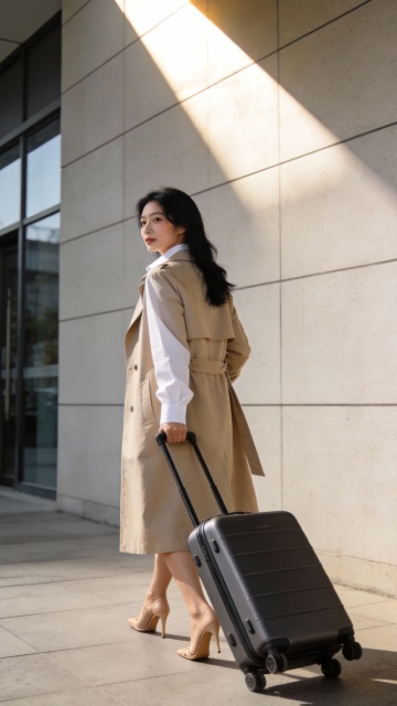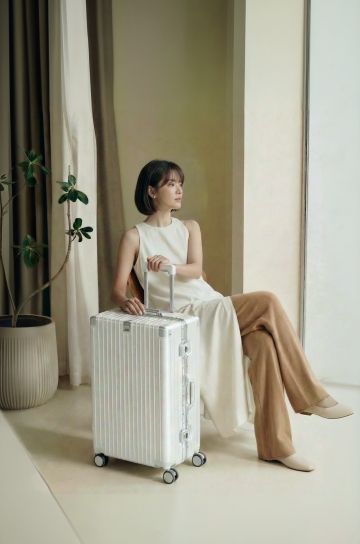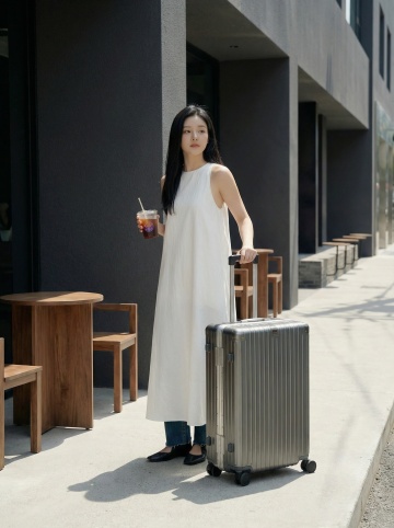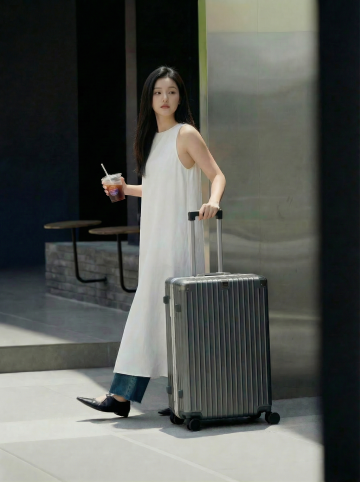 简约主义风格,清新舒适的阳光洒入,行李箱与风扇点缀,营造温馨住宿氛围。