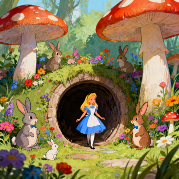 梦幻感与卡通感交织的插画风场景,拟人化的兔子与童话元素营造温馨趣味,爱丽丝从神秘隧道走出,宛如进入童话故事中的奇妙世界。