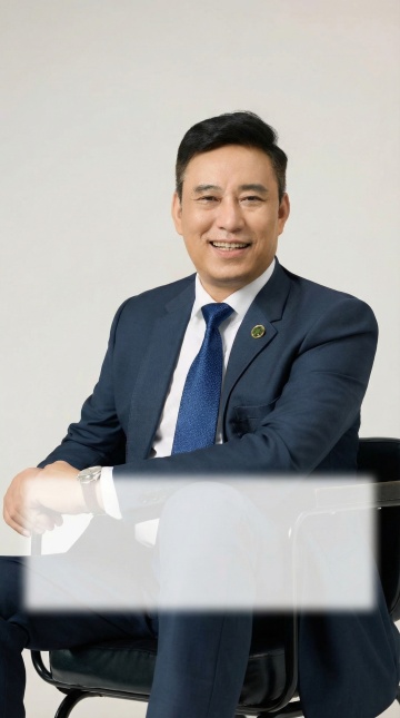 保留人物脸型、发型、年龄特征生成标准职场形象照,50MM焦段,F/4光圈(F/2.8-F/4区间),相机与人物距离3米,横向16:9比例(左右预留环境空间),人物占画面60%,入镜头部至膝盖上方5CM,平视视角,人物居中构图,头肩比例协调,身穿深墨蓝色西装,内搭白色衬衫,精致且高级的深蓝色斜向微微渐隐光泽感极细条纹商务感领带,下装黑色西裤搭配黑色皮带;正面抱胸姿态,肢体舒展的站立姿态,自信从容;主