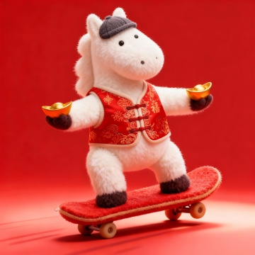 3D卡通马拟人化设计,身穿红色唐装,手持金元宝,踩着毛绒滑板,毛发生长质感细腻,喜庆可爱,节日氛围浓厚。