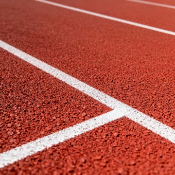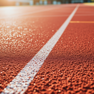 阳光明媚的晴朗白天,明亮的蓝色天空中点缀着几朵白云,阳光从画面左上方照射下来,形成清晰的光影效果,展现一个常规学校操场的场景。前景是红色塑胶跑道,表面有细腻的颗粒质感,白色分道线清晰笔直,跑道呈现自然的弯道曲线。跑道内侧是修剪整齐、色泽鲜亮的绿色草坪足球场。左侧远处是带有灰色座椅的白色顶棚看台,看台后方和右侧背景是茂密的绿色树木,远处还有一栋浅色的教学楼建筑。整体画面采用写实摄影风格,色彩鲜艳饱和,光线充足,具有清晰的景深效果,近景跑道细节锐利,远景建筑和树木稍显模糊,营造出开阔、整洁、充满活力的校园运动氛围。
