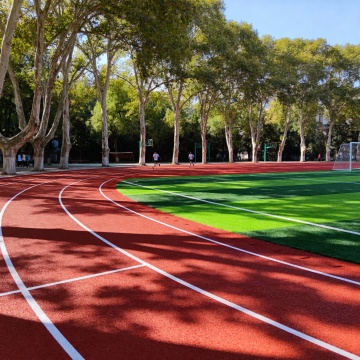 阳光明媚的晴朗白天,明亮的蓝色天空中点缀着几朵白云,阳光从画面左上方照射下来,形成清晰的光影效果,展现一个常规学校操场的场景。前景是红色塑胶跑道,表面有细腻的颗粒质感,白色分道线清晰笔直,跑道呈现自然的弯道曲线。跑道内侧是修剪整齐、色泽鲜亮的绿色草坪足球场。左侧远处是带有灰色座椅的白色顶棚看台,看台后方和右侧背景是茂密的绿色树木,远处还有一栋浅色的教学楼建筑。整体画面采用写实摄影风格,色彩鲜艳饱和,光线充足,具有清晰的景深效果,近景跑道细节锐利,远景建筑和树木稍显模糊,营造出开阔、整洁、充满活力的校园运动氛围。