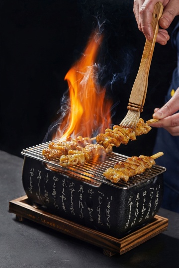 中式烧烤实景感,3D重拟物风呈现鱿鱼串炙烤瞬间,烟雾缭绕光影交错,质朴木质背景衬托美食风,金属烤架与香料点缀,油画质感浓郁。