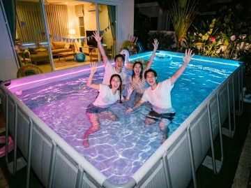 高清晰度写实摄影风格,夏日泳池场景,清澈见底的蓝绿色池水,阳光透过水面形成波光粼粼的光影效果,池边铺有浅棕色防滑地砖,白色与深蓝色相间的瓷砖池壁,金属质感的银色泳池扶手延伸至水中,水面漂浮着几片鲜艳的粉色和黄色花瓣,池边摆放着一把带有彩色条纹的遮阳伞和几张藤编躺椅,旁边放着一杯冰镇饮料和一本翻开的杂志,远处有几棵高大的棕榈树投下斑驳的阴影,整体画面呈现出明亮、清爽、悠闲的夏日氛围,光线充足,色彩饱和度高,细节清晰,无LOGO、电话地址及二维码。