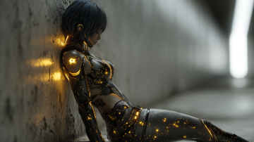 赛博朋克风机械女性,融合未来感与科技感,金属机身搭配霓虹灯背景,3D重拟物设计展现机能美学。