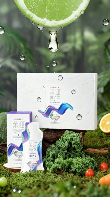 质朴感与清新感交融,金属托盘承载绿瓶精华,搭配无花果与枯枝,3D重拟物风呈现自然疗愈之美,简约主义中透出柔和舒适,实景感十足。