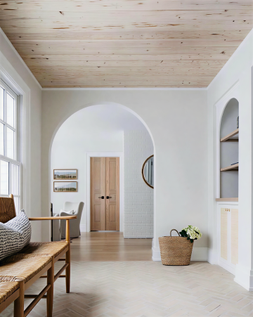一张餐桌背景图,前景是纹理清晰、带有自然木纹的木质桌面,桌面光感柔和,呈现温暖的浅棕色,边缘略微模糊。背景是模糊的室内环境,整体氛围温馨舒适,光线柔和,以暖黄色调为主,隐约可见拱形门、悬挂的长条形暖光灯具、绿植以及远处模糊的桌椅和人影,营造出休闲惬意的用餐环境。