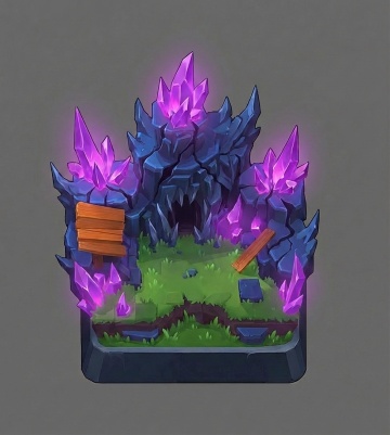 梦幻插画风,虚拟自然景观,紫色晶石与荧光植物点缀,营造神秘仙境氛围。