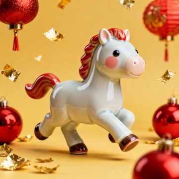 萌趣喜庆风设计,浅蓝陶瓷小马与红灯笼金箔等新年元素结合,营造红火欢乐的马年氛围