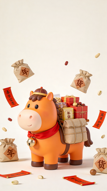 软3D风卡通小马驮满年货,国潮元素融合喜庆红与暖色系,粘土质感萌趣十足,传递春节团圆祥和氛围。