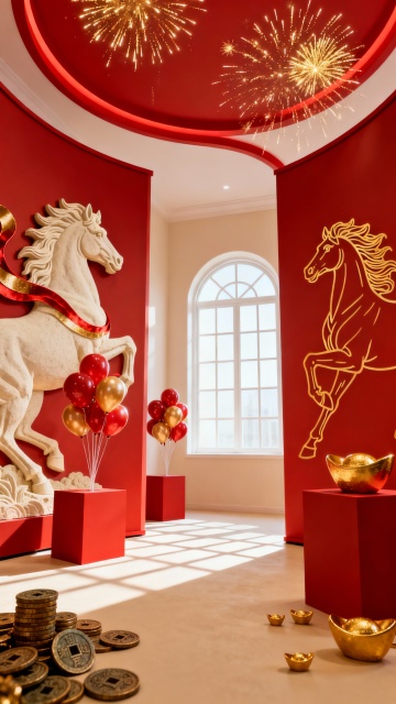 低多边形剪纸风红马,融合中式元素与几何造型,喜庆氛围浓厚,立体体积感强,寓意新春吉祥如意。
