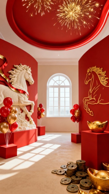 国潮风彩灯马,融合民族纹样与光影效果,轻拟物设计展现中式喜庆,霓虹光晕营造梦幻氛围,玻璃质感增强体积感。